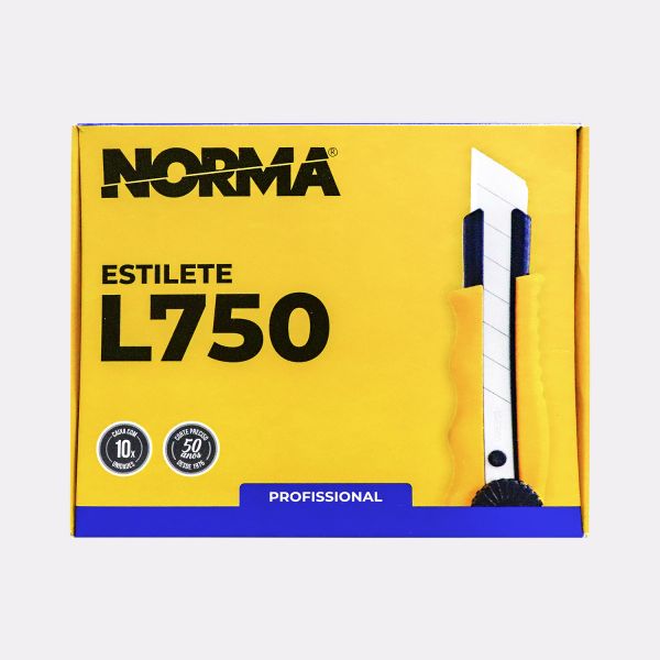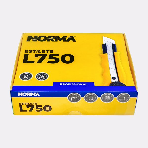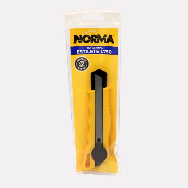 O Estilete Profissional Norma L750 é largo e possui empunhadura ergonômica, possibilitando encaixe perfeito na mão. A lâmina 18mm é de aço carbono com oito segmentos, o que a torna prática e econômica. Possui dois ângulos de afiação, o que permite grande profundidade no corte. Com trava tipo roldana e guia da lâmina em aço carbono, é a ferramenta ideal para cortes precisos. É recomendado para trabalhos pesados, em materiais como carpete, borracha, filme laminado, couro e piso vinílico. É indicado para a indústria e empresas de comunicação visual.