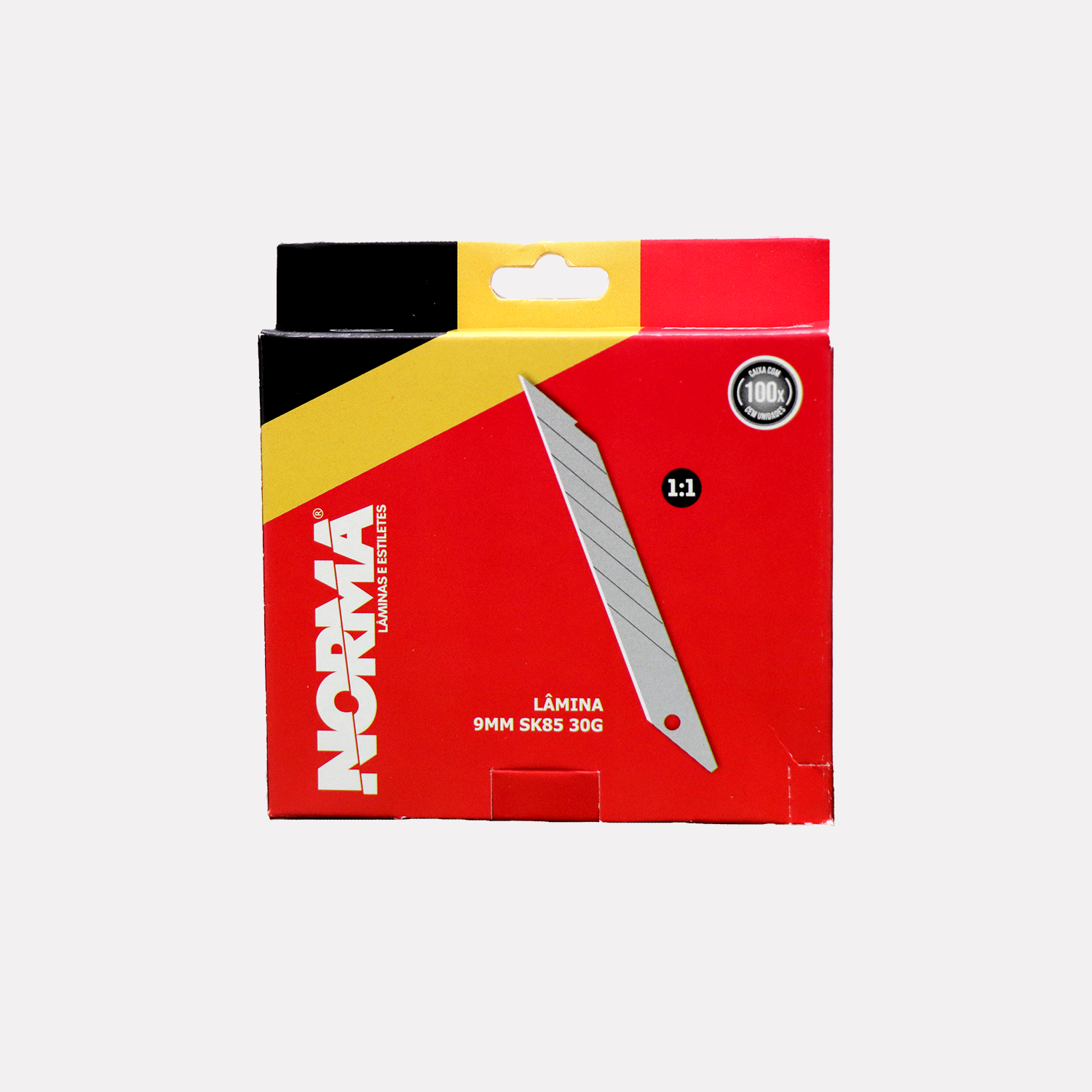 A lâmina para estilete Norma SK85 9mm de 30 graus é segmentada em nove partes e fabricada na China, em aço carbono JIS G 4401:2009-SK85 (SK5). Possui um ótimo custo-benefício, ainda mais para a rotina de trabalho que requer uma solução de corte de precisão eficiente. É recomendada para trabalhos precisos, em materiais como papel, adesivo e película. É indicada para as atividades do segmento de comunicação visual e empresas similares.